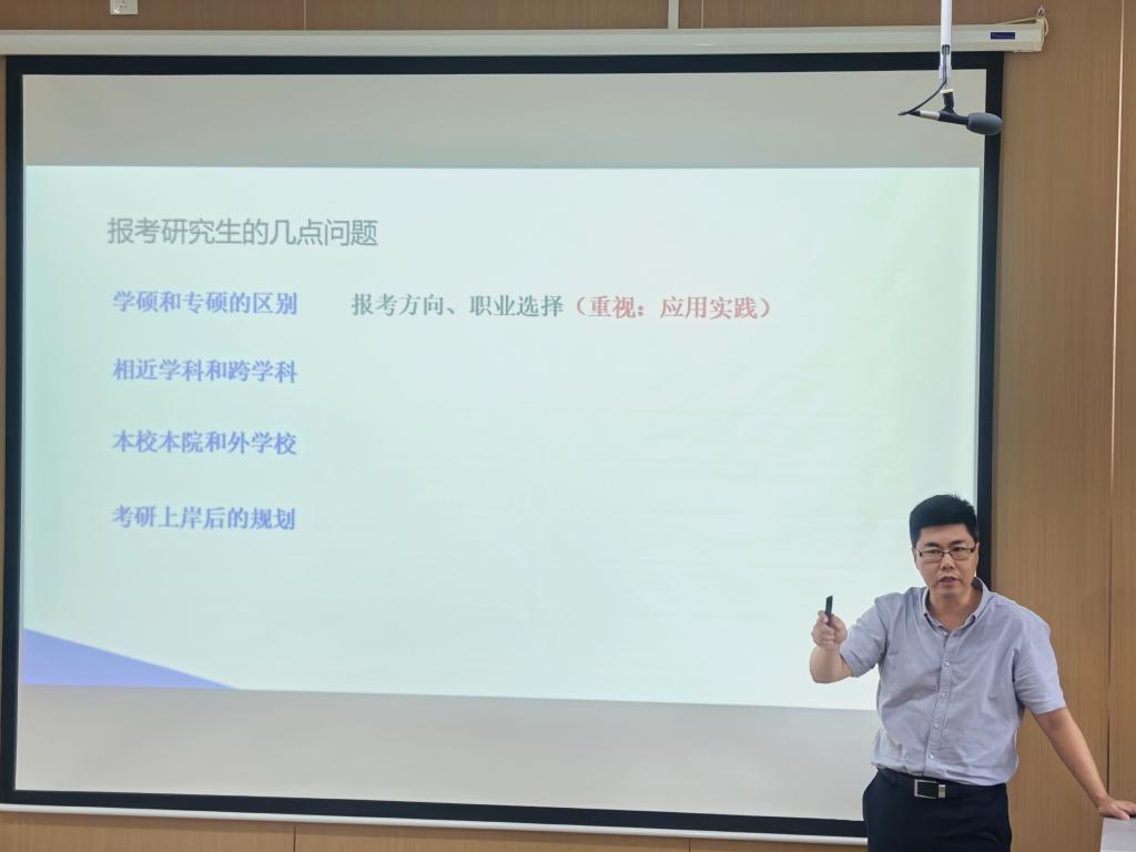 本次活动,郝翔围绕报考研究生的核心问题,为同学们详细解读考研与保研的相关政策,包括学硕与专硕区别、学科选择、院校选择及考研规划等问题。他结合近十年全国考研数据和学院近3年本科升学情况,为同学们分析了未来考研竞争态势。同时,介绍了学院今年首次组织的优秀本科生推免情况,鼓励同学们积极争取保研机会,为升学之路拓宽渠道。