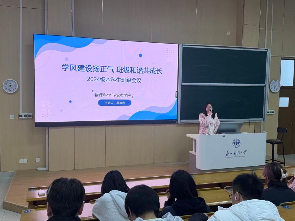 为筑牢班级发展根基,营造优良育人氛围,近日,物理科学与技术学院召开2024级“学风建设扬正气、班级和谐共成长”主题班会。2024级全体学生参会,辅导员顾彦秋主持并主讲。