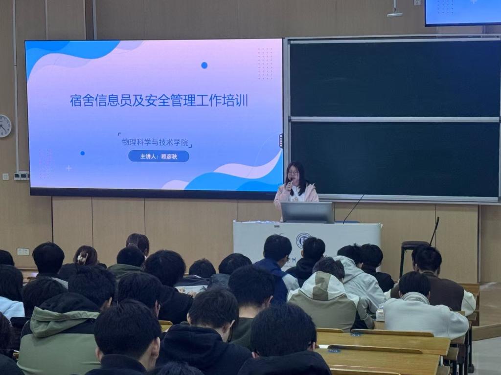 筑牢校园安全防线,强化宿舍安全管理责任,2025年11月25日,物理科学与技术学院开展学生宿舍安全工作专题培训会。本次培训由辅导员顾彦秋主讲,2024级全体宿舍舍长及各班主要学生干部参加,共同学习安全规范,筑牢宿舍安全“防火墙”。